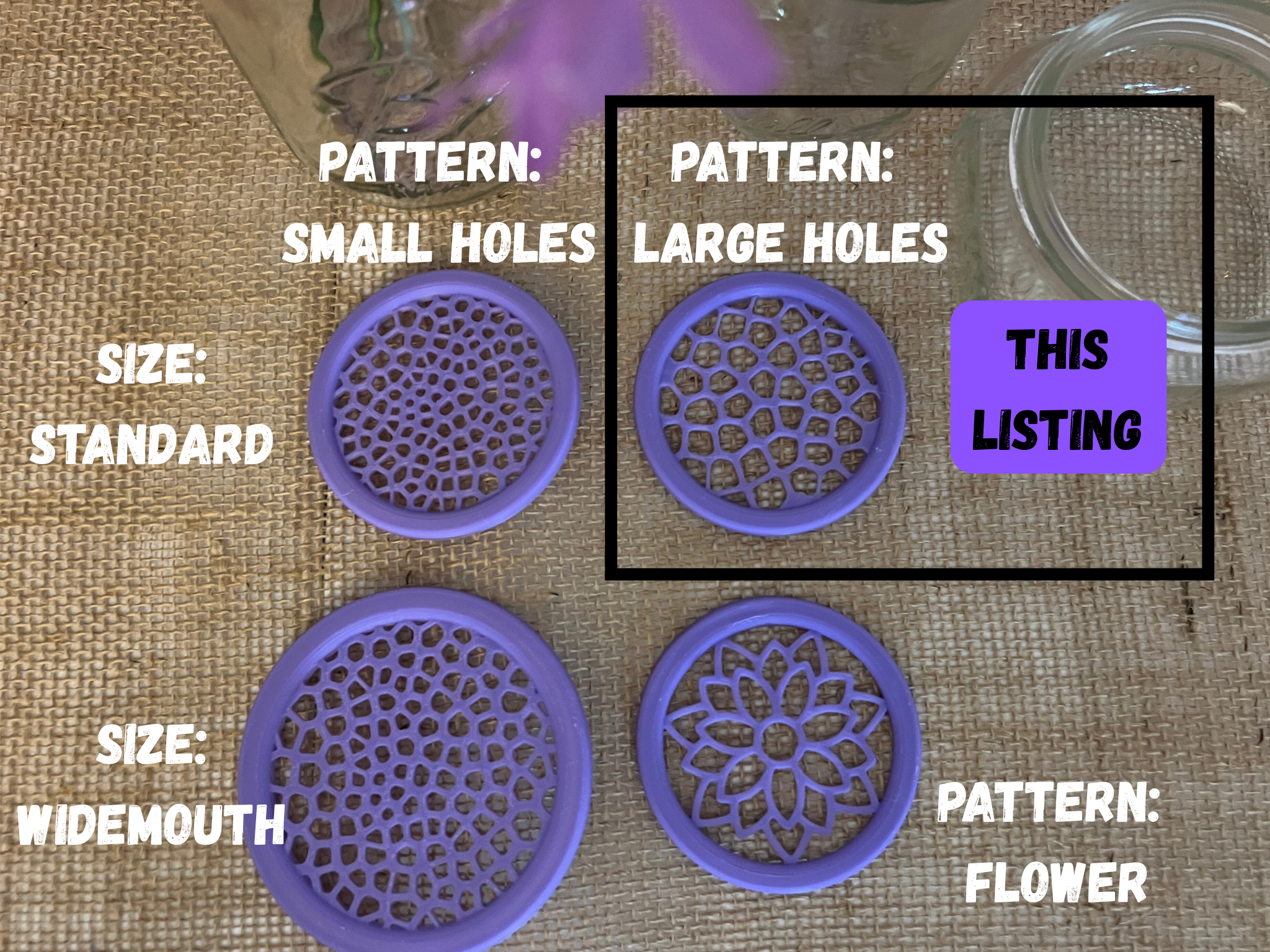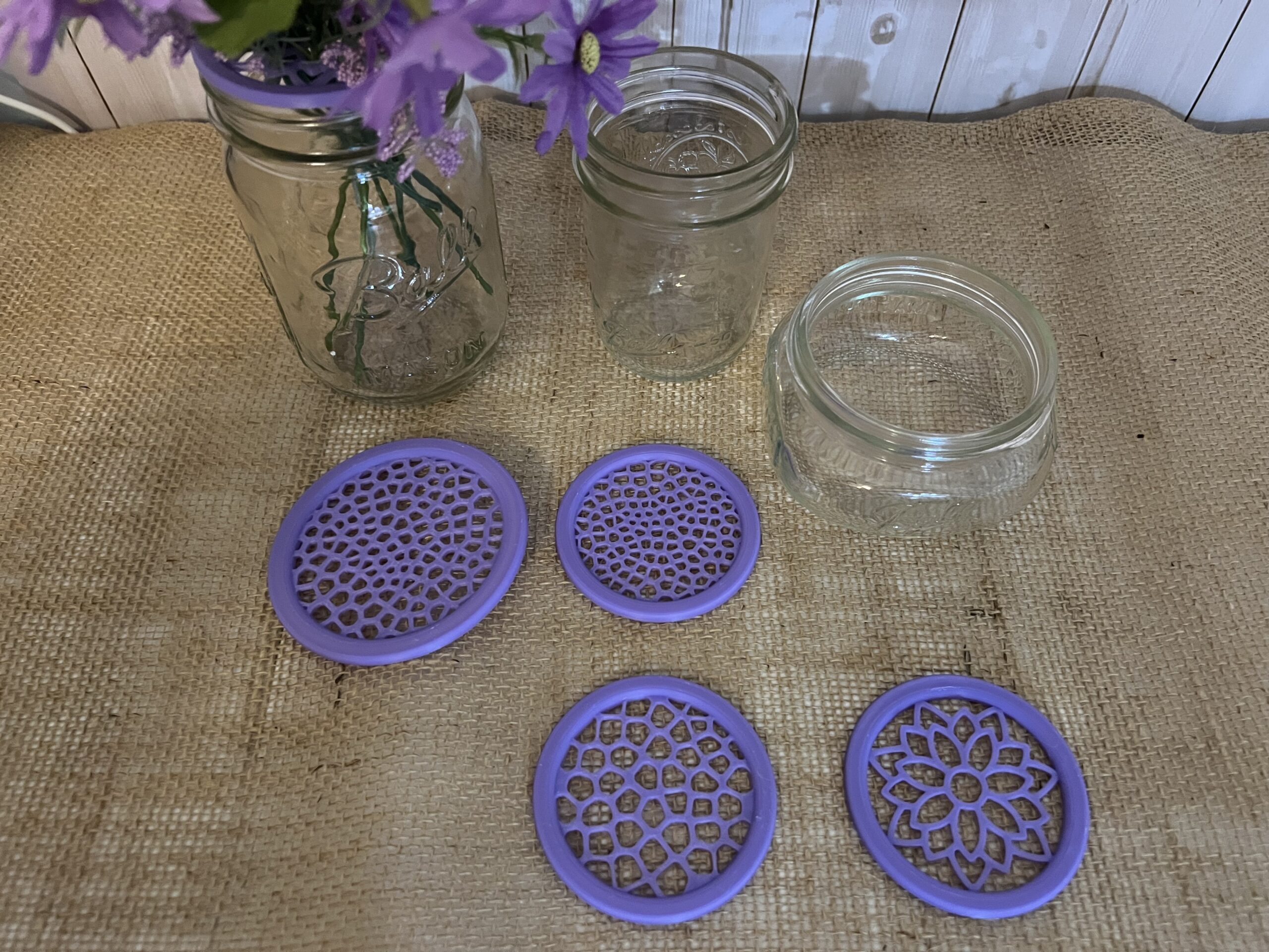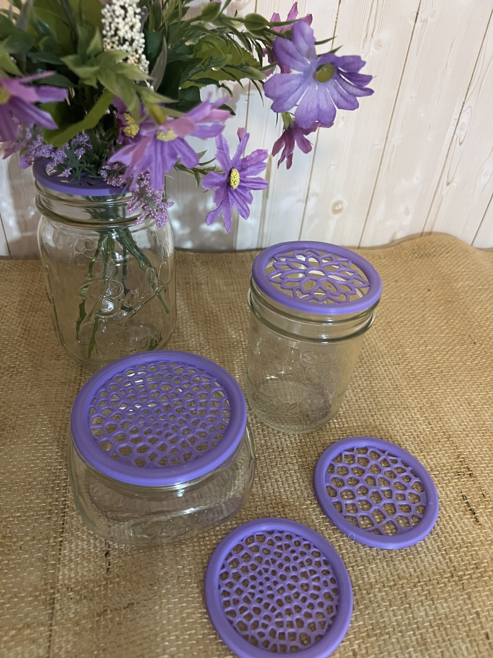 This is a modified version of our aerated lid insert for mason jar with slightly larger holes for better use as a flower frog. This mason jar cover with holes can be made for a standard or wide mouth canning jar, in various colors.